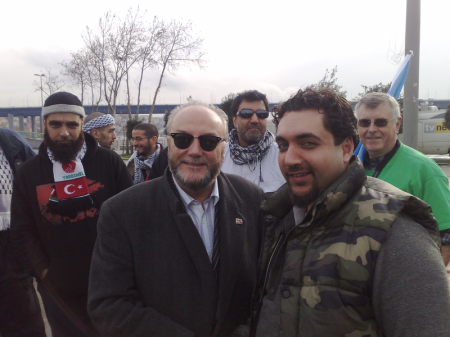 Afterwards we all began to make our way to the centre and to FESHANE near EYUP which is like a big car park near the sea, in central Istanbul. We were guided to the place and even had air support, a helicopter was hovering around above us. I have to say the pilot was very skilled and kept going around in a perfect circle, which meant I could plan and take my photos well. There was a gathering and then the Big G, George Galloway himself turned up, he remembered me from my previous trip to Gaza, and especially the Libyan incident, I think he was still a bit disgruntled about that, but thats what happens when you mess with the Professionals like myself, I am not here for politics, just here to get a job done.